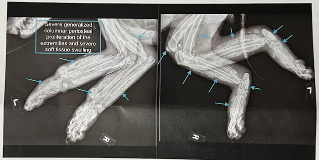 - A lot of extra bone growth in her 4 legs – it is too late to reverse it but if we can get the right treatment, we may be able to retard the growth and hopefully she will be in lesser pain.